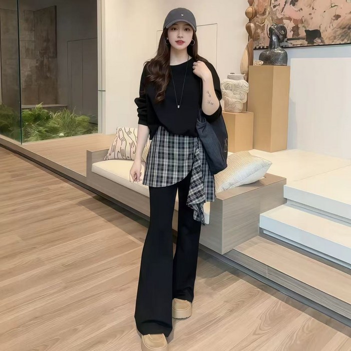 COSYEVNO 여성 춘추 체크 레이어드톱 와이드 팬츠 세트 LFHnstz4