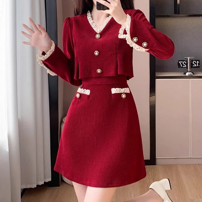 비비에모 모렌 레이스 배색 코듀로이 원피스 11629