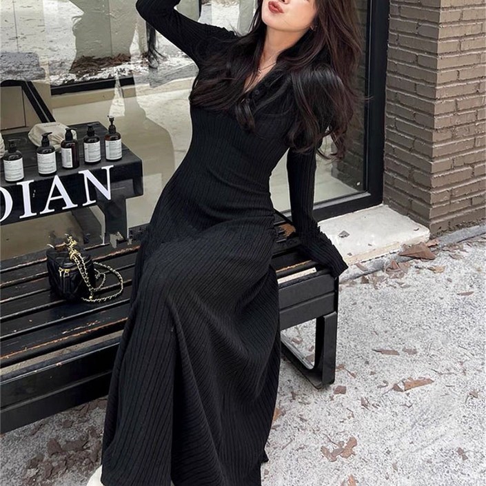 cammello 브이넥 슬림핏 골지 플레어 미니원피스 긴팔 A라인 드레스 하객룩