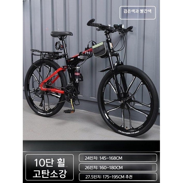 접이식 자전거 듀얼 디스크 브레이크 산악용 MTB 오프로드 서스펜션 변속기어 스틸프레임 24인치 26인치 27.5인치, 스틸 프레임 10날 휠검빨