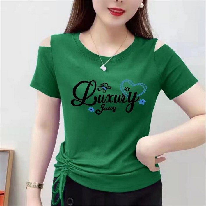 besteffie 여성용 여름 패션 반팔티셔츠 어깨 트임 스트링 장식 캐주얼 티셔츠 예쁜티셔츠 K95